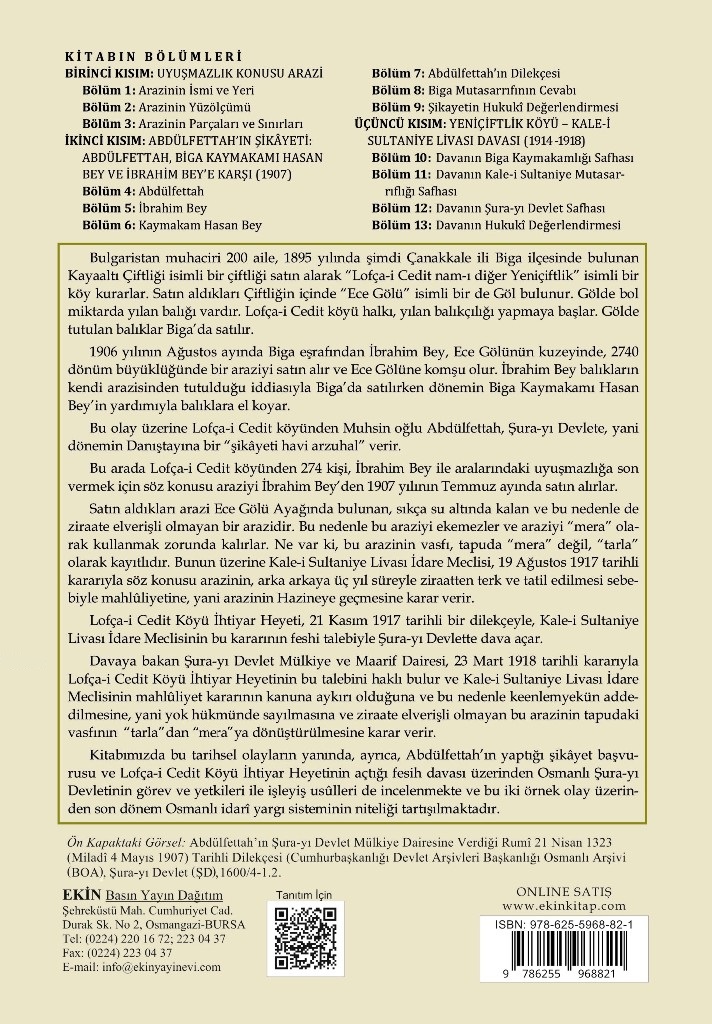 Kitabımızda ayrıca Abdülfettah’ın şikâyet başvurusu ve keza Lofça-i Cedit Köyü İhtiyar Heyetinin Kale-i Sultaniye Livası İdare Meclisi kararına karşı açtığı fesih davası üzerinden Osmanlı Şura-yı Devletinin görev ve yetkileri ile işleyiş ve yargılama usûlleri de incelenmekte ve bu iki örnek olay üzerinden son dönem Osmanlı idarî yargı sisteminin niteliği tartışılmaktadır.